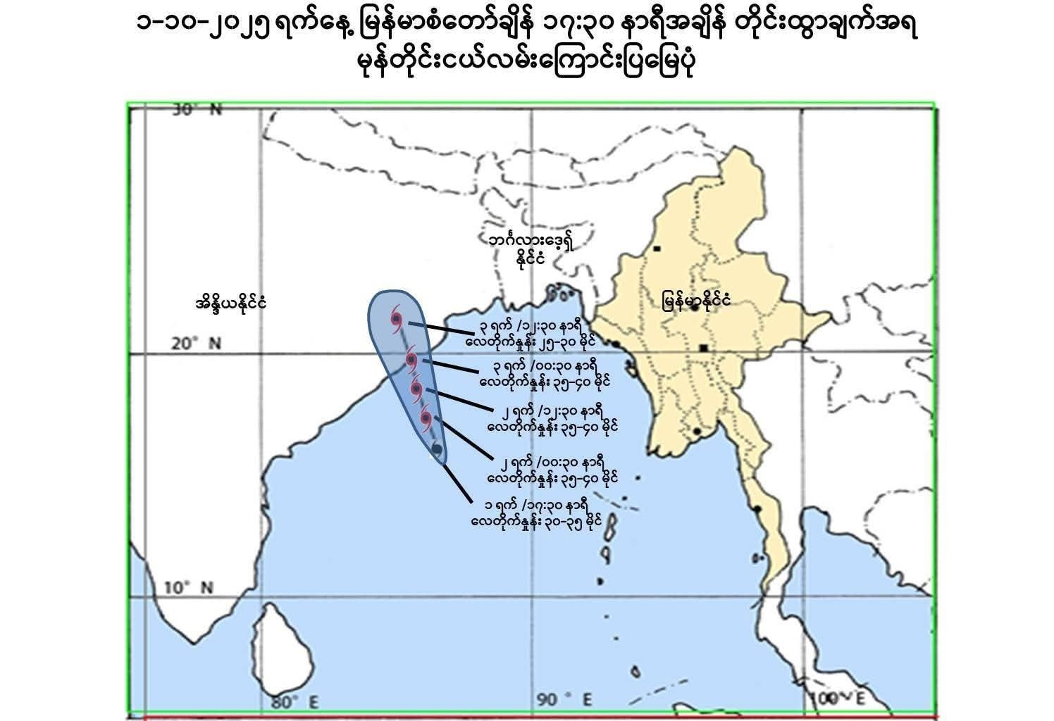 မုန်တိုင်းငယ်၏အရှိန်ကြောင့် မိုးသည်းထန်စွာရွာသွန်းခြင်းနှင့်အတူ လေပြင်း တိုက်ခတ်ခြင်း၊ ရုတ်တရက်ရေကြီးခြင်းနှင့် မြေပြိုခြင်းတို့ဖြစ်ပေါ်နိုင်ကြောင်း စစ်ကော်မရှင်လက်အောက်ရှိ မိုးလေဝသနှင့် ဇလဗေဒညွှန်ကြားမှုဦးစီးဌာနက ယနေ့ညထုတ်ပြန်သည်။