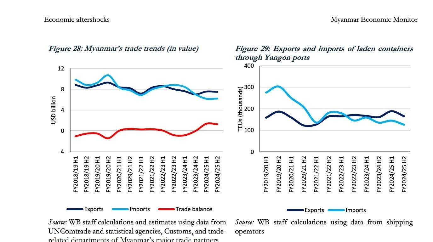 စစ်တပ်အာဏာသိမ်းထားသည့် ၂၀၂၀-၂၁ နှစ်ဝက်တွင် လိုငွေအနည်းဆုံးဖြစ်ခဲ့ပြီး ၂၀၂၃-၂၄ နှစ်ဝက်မှာ လိုငွေ အနည်းငယ်လျော့ကျခဲ့ပြီး ၂၀၂၄-၂၅ နှစ်ဝက်တွင် ကုန်သွယ်မှု ပိုငွေ (Trade surplus) အနည်းငယ်ပြနေကြောင်း ကမ္ဘာ့ဘဏ်က ဆိုထားသည်။