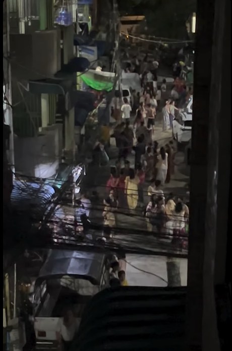 ပုံစာ-ရန်ကုန်မြို့တွင် ငလျင် လှုပ်ခပ်ပြီးနောက် အထပ်မြင့် တိုက်ခန်းတွင် နေထိုင်သူများ လမ်းပေါ် ထွက်လာသည်ကို တွေ့ရစဉ်။