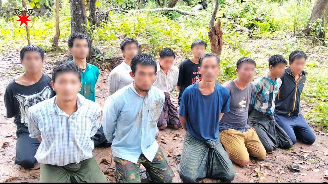 ပုံစာ- အောက်တိုဘာ ၁၇ ရက်နေ့တွင် AA က ဖမ်းဆီရမိသူများနှင့် အလင်းဝင်ရောက်လာသူ စစ်ကော်မရှင် တပ်ဖွဲ့ဝင်များအားတွေ့ရစဉ်။