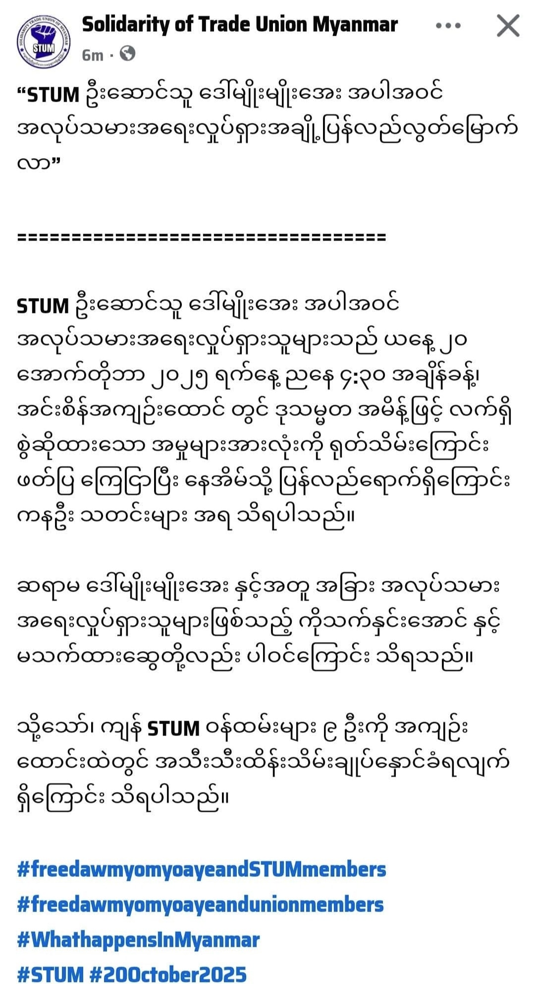 အလုပ်သမားအရေးတတ်ကြွလှုပ်ရှားသူသွေးစည်းညီညွတ်သော သမဂ္ဂများအဖွဲ့ချုပ် မြန်မာ STUM ဦးဆောင်သူ ဒေါ်မျိုးမျိုးအေး အပါအဝင် အလုပ်သမားအရေးလှုပ်ရှားသူများသည် ယနေ့ ( အောက်တိုဘာ ၂၀) ရက်နေ့တွင် စစ်ကော်မရှင်က ပြန်လွှတ်ပေးခဲ့ကြောင်း သိရသည်။