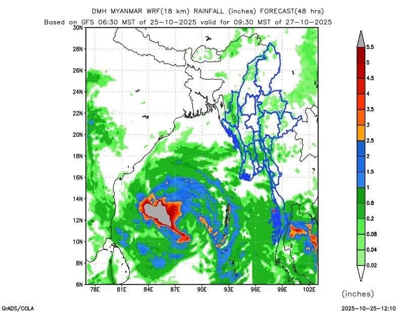 လက်ရှိဖြစ်ပေါ်မုန်တိုင်းငယ်အရှိန်ကြောင့် အောက်တိုဘာ ၂၆ ရက်နေ့တွင် တနဿ်ာရီတိုင်းအတွင်း နေရာစိပ်စိပ်နှင့် ကချင်ပြည်နယ်တွင် နေရာကျဲကျဲမိုးထစ်ချန်းရွာမည်ဖြစ်ကြောင်းထုတ်ပြန်ထားသည်။