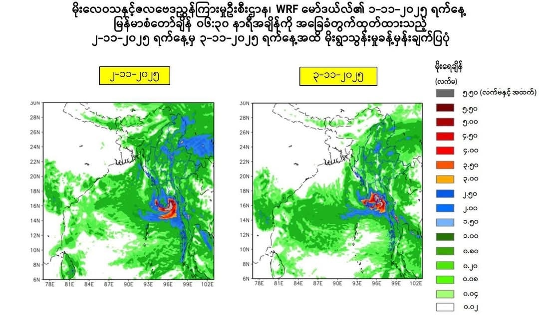 ကပ္ပလီပင်လယ်ပြင်မြောက်ပိုင်းနှင့် ယင်းနှင့်ဆက်စပ်လျက်ရှိသော ဘင်္ဂလားပင်လယ်အော် အရှေ့အလယ်ပိုင်းတို့တွင် ဖြစ်ပေါ်နေသော လေဖိအားနည်းရပ်ဝန်းဆက်လက်တည်ရှိနေကာ လာမည့်တစ်ပတ်အတွင်း ဒေသအလိုက်နေရာကွက်၍ မိုးကြီးမည်ဖြစ်ကြောင်း မိုးလေဝသနှင့် ဇလဗေဒညွှန်ကြားမှုဦးစီးဌာန(မိုး/ဇလ) က ထုတ်ပြန်သည်။