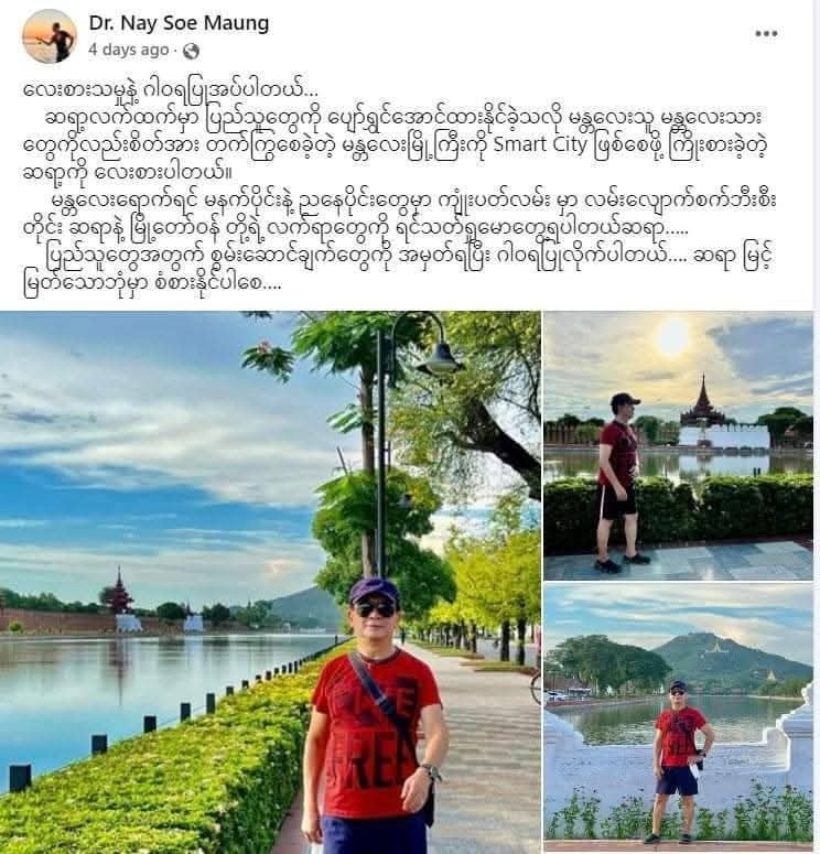 “နောင်ဘဝမှာ လူဖြစ်ခဲ့လျှင် လွတ်လပ်တရားမျှတပြီး လူကို လူလိုဆက်ဆံတဲ့နိုင်ငံမှာ လူပြန်ဖြစ်ပြီး လူသားတွေရဲ့အကျိုးကို ဆက်လက်သယ်ပိုးနိုင်ပါစေ”ဟု ဒေါက်တာနေစိုးမောင်က မန္တလေးတိုင်းဝန်ကြီးချုပ် ဒေါက်တာဇော်မြင့်မောင်၏ သေဆုံးမှုကို ၎င်း၏လူမှုကွန်ရက်စာမျက်နှာတွင် ရေးသားခဲ့ခြင်းဖြစ်သည်။