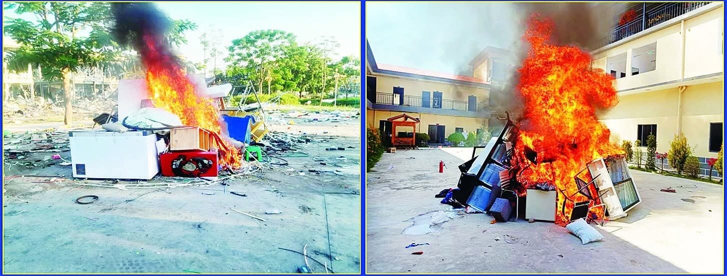 စစ်ကော်မရှင်နှင့် နယ်ခြားစောင့်တပ်ထိန်းချုပ်ထားရာ မြန်မာ – ထိုင်းနယ်စပ်ရှိ အွန်လိုင်းလိမ်လည်မှုနှင့် လောင်းကစားလုပ်ငန်းများလုပ်သည့်နေရာများကို ရှင်းလင်ပြီး KK park အတွင်းရှိ ကွန်ပျူတာ၊ ဖုန်း၊ အဆောက်အအုံများကိုဦးစွာဖျက်ဆီးရှင်းလင်းခဲ့သည်။