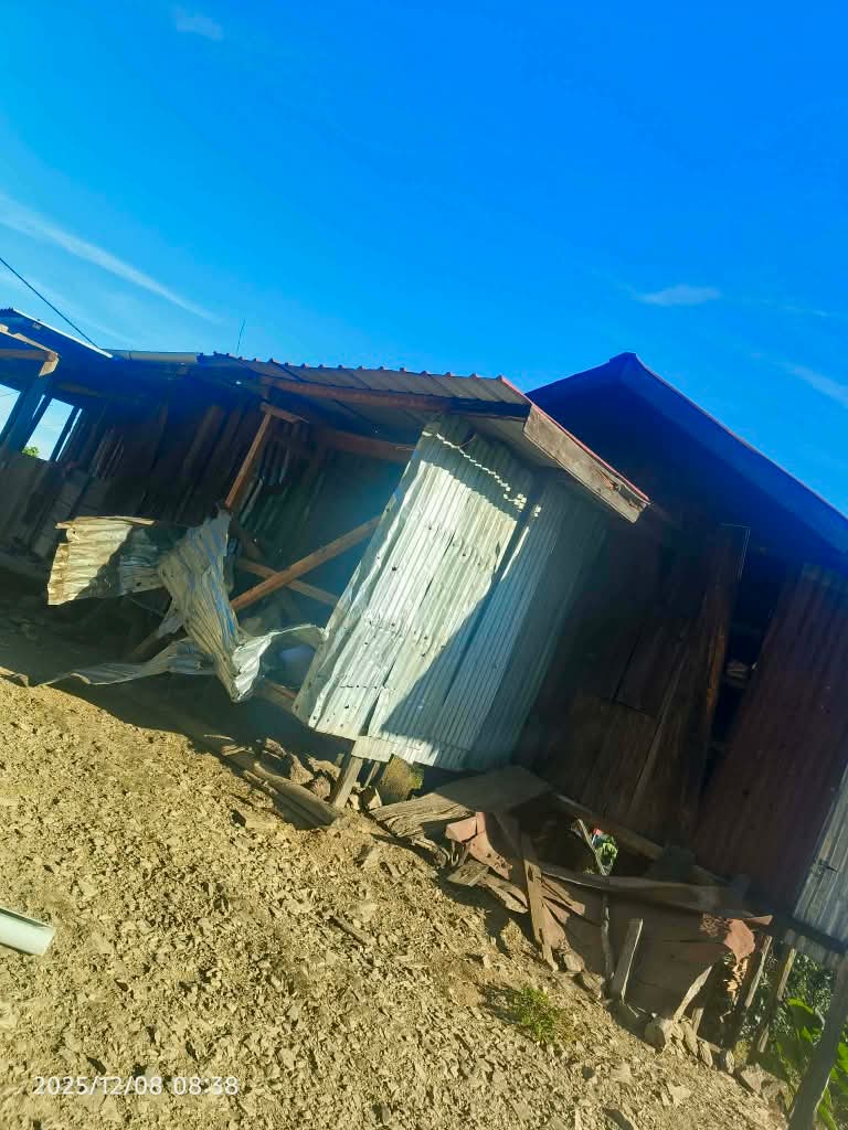 ပုံစာ – ဖလမ်းမြို့နယ်တွင် ယမန်နေ့ ဒီဇင်ဘာ ၇ ရက်နေ့ စစ်ကော်မရှင် လေကြောင်း တိုက်ခိုက်မှု ကြောင့် ပျက်စီးသွားသည့် နေအိမ်များကို တွေ့ရစဥ်(ပေးပို့)