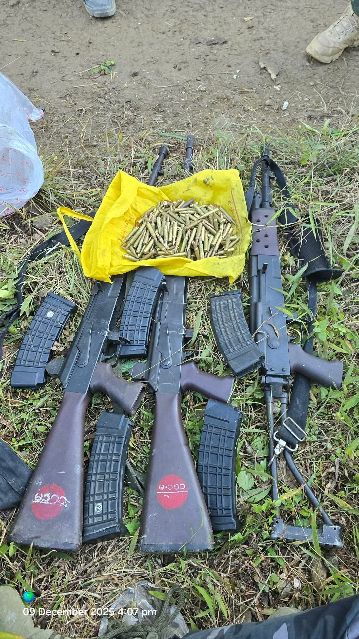 ပုံစာ- ဖလမ်းမြို့အနီးတွင် ဖမ်းဆီးရမိသည့် စစ်သုံ့ပန်းနှင့် သိမ်းဆည်းရမိသည့် လက်နက်ခဲယမ်းများကို တွေ့ရစဥ်။