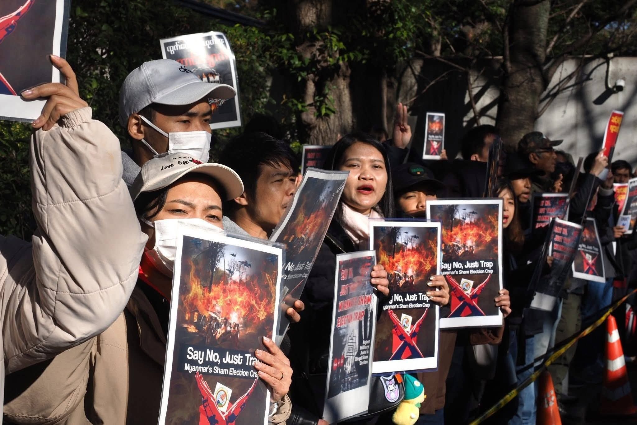 ဂျပန်နိုင်ငံရောက် မြန်မာနိုင်ငံသားများကလည်း စစ်အုပ်စု၏ အတုအယောင်ရွေးကောက်ပွဲမှ မည်သည့်ရလဒ်ထွက်ပေါ်စေကာမူ အစစ်အမှန်မဟုတ်သည့်အတွက် အသိအမှတ်မပြုကြောင်းကို တိုကျိုမြို့ရှိ သံရုံးရှေ့တွင် ဆန္ဒထုတ်ဖော်ခဲ့ကြသည်။