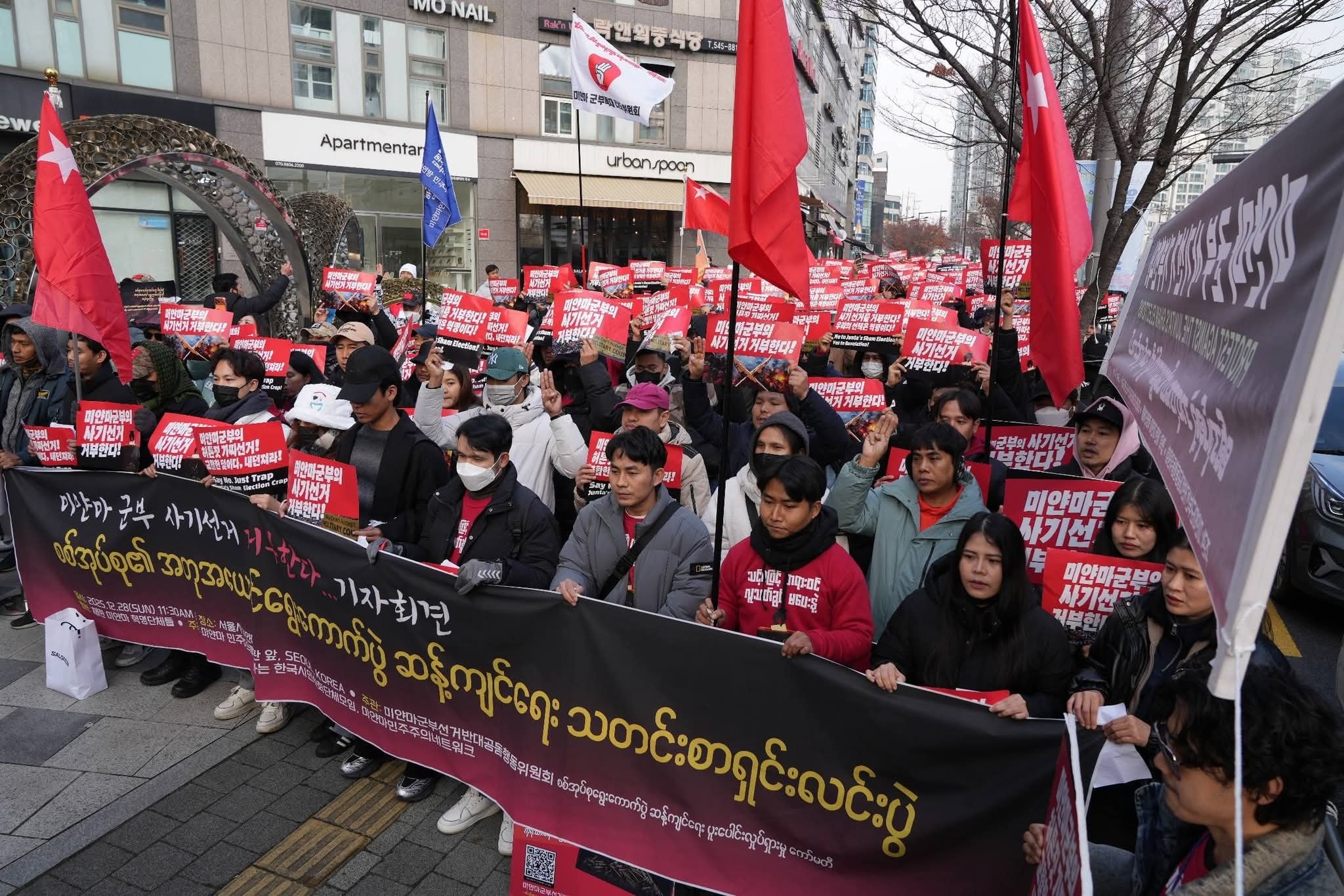 ထို့အတူ တောင်ကိုရီးယားနိုင်ငံရောက် မြန်မာ နိုင်ငံသား ၂၅၀ ကျော်ကလည်း စစ်ကော်မရှင် ၏သက်ဆိုင်ရာသံရုံးများရှေ့တွင် ရွေးကောက်ပွဲကို ဆန့်ကျင်ကြောင်းဆန္ဒပြခဲ့ကြပြီး ကိုရီးယား အရပ်ဘက်အဖွဲ့အစည်းများလည်း တက်ရောက်ခဲ့သည်။
