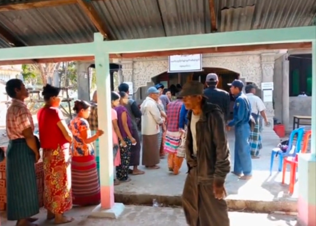 ဓာတ်ပုံ-သာပေါင်းမြို့နယ်တွင် စစ်တပ်ကဒုက္ခပေးမည်စိုး၍ ဒေသခံအများမှ မဲပေးနေကြရသည့်မြင်ကွင်း