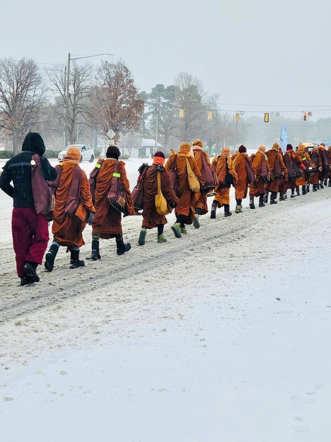 တက္ကဆက်ပြည်နယ်မှ မြို့တော်ဝါရှင်တန်ဒီစီသို့ ဦးတည်လျှောက်လှမ်းနေသည့် အဆိုပါ “ငြိမ်းချမ်းရေးခရီးစဉ်” (Walk for Peace) တွင် ရဟန်းတော်များသည် လက်ရှိ မြောက်ကယ်ရိုလိုင်းနားပြည်နယ်ရှိ အလွန်ပြင်းထန်သော နှင်းမုန်တိုင်းနှင့် အေးခဲသည့် ရာသီဥတုကို ကြံ့ကြံ့ခံကာ ဆက်လက်ကြွမြန်းလျက်ရှိသည်။