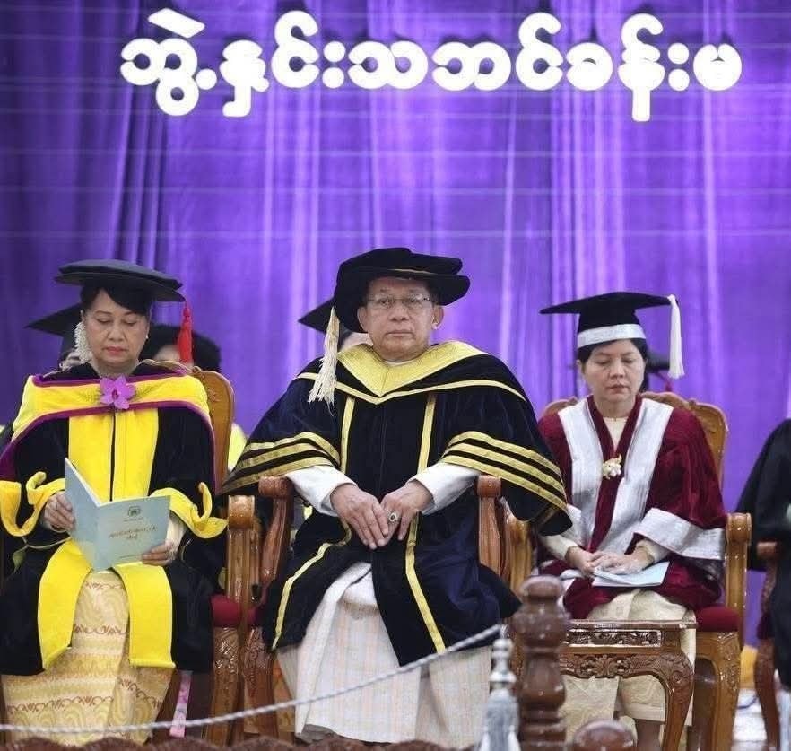 စစ်ကော်မရှင်ခန့် ပညာရေးဝန်ကြီး ဒေါက်တာချောချောစိန်က စစ်ခေါင်းဆောင်သည် ၎င်း၏ လက်ထက်အတွင်း နိုင်ငံရေး၊ စီးပွားရေး စသည့် စိန်ခေါ်မှုများကို စနစ်တကျ စီမံခန့်ခွဲနိုင်သည်ဟုဆိုကာ ယမန်နေ့ ဖေဖော်ဝါရီ ၅ ရက်တွင် ရန်ကုန်တက္ကသိုလ် ဘွဲ့နှင်းသဘင်ခန်းမ၌ “ဂုဏ်ထူးဆောင် ပြည်သူ့ရေးရာ စီမံခန့်ခွဲမှုပါရဂူဘွဲ့” ကို အပ်နှင်းခဲ့သည်။