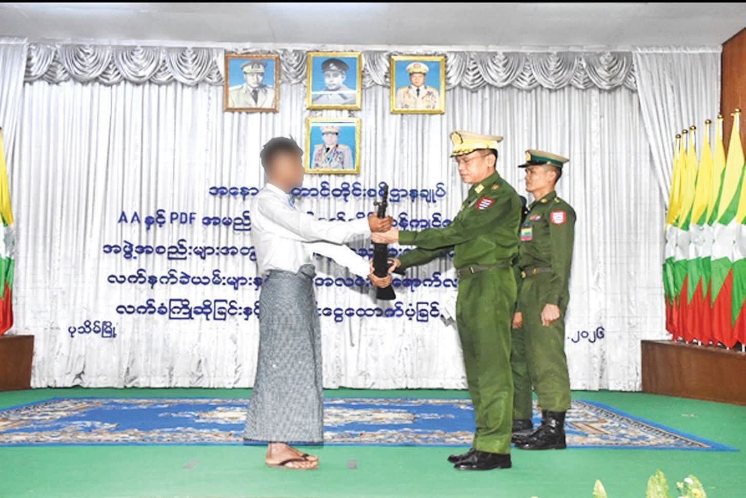 မောင်းပြန်ရိုင်ဖယ် နှစ် လက်၊ လက်ပစ်ဗုံး လေးလုံးတို့နှင့် ဥပဒေဘောင်အတွင်း ဝင်ရောက်လာသည့် အတွက် သေနတ်တစ်လက်လျှင် သိန်း၅၀၊ ဗုံးတစ်လုံး ၃သိန်း၊ လူတစ်ဦး ၃သိန်းကျပ်စီ ပေးအပ်ခဲ့ပြီး မိဘများထံအပ်နှံခဲ့သည်ဟု စစ်ကော်မရှင် ဝါဒဖြန့်သတင်းစာများတွင် ဖော်ပြပါရှိသည်။