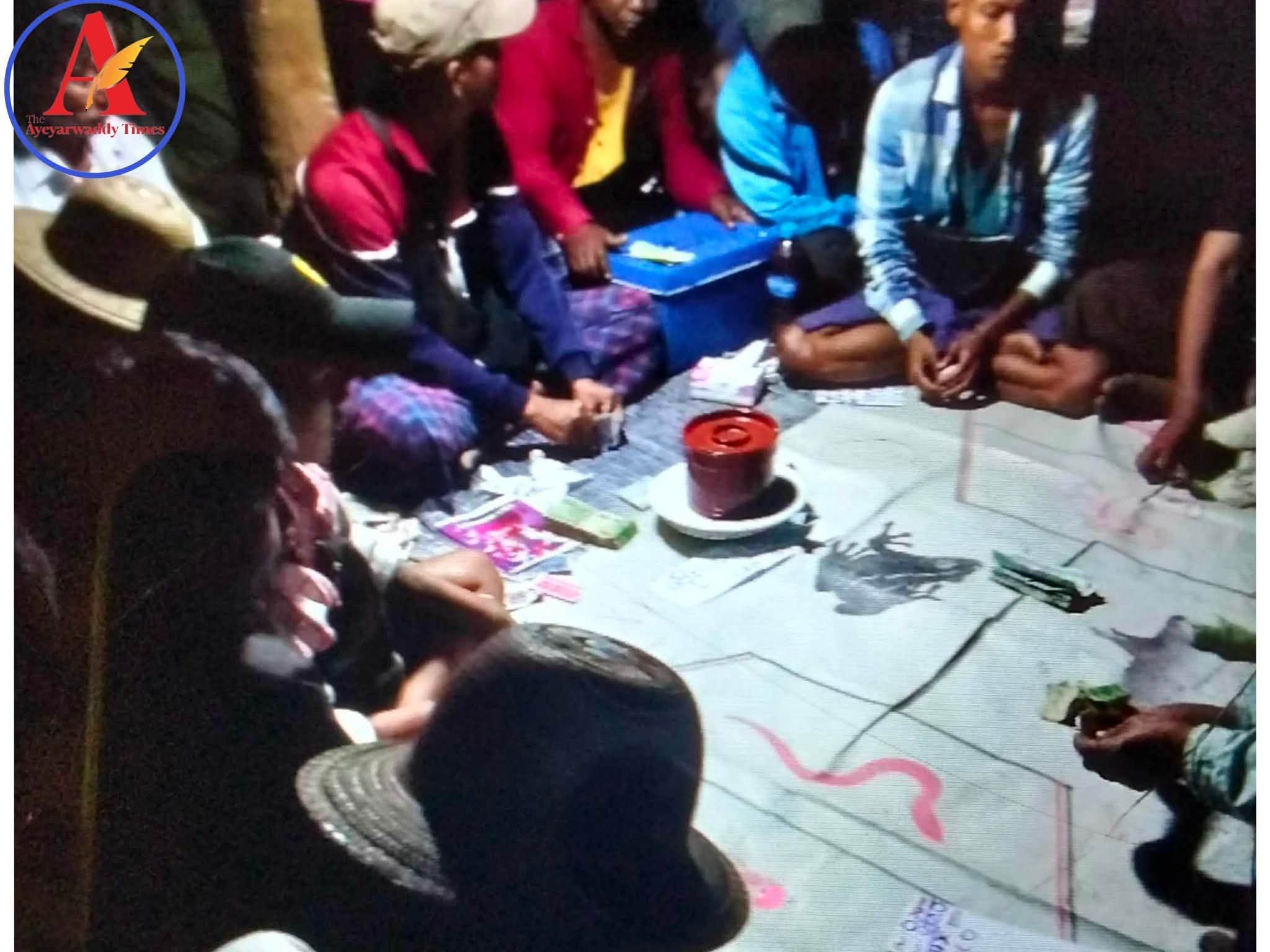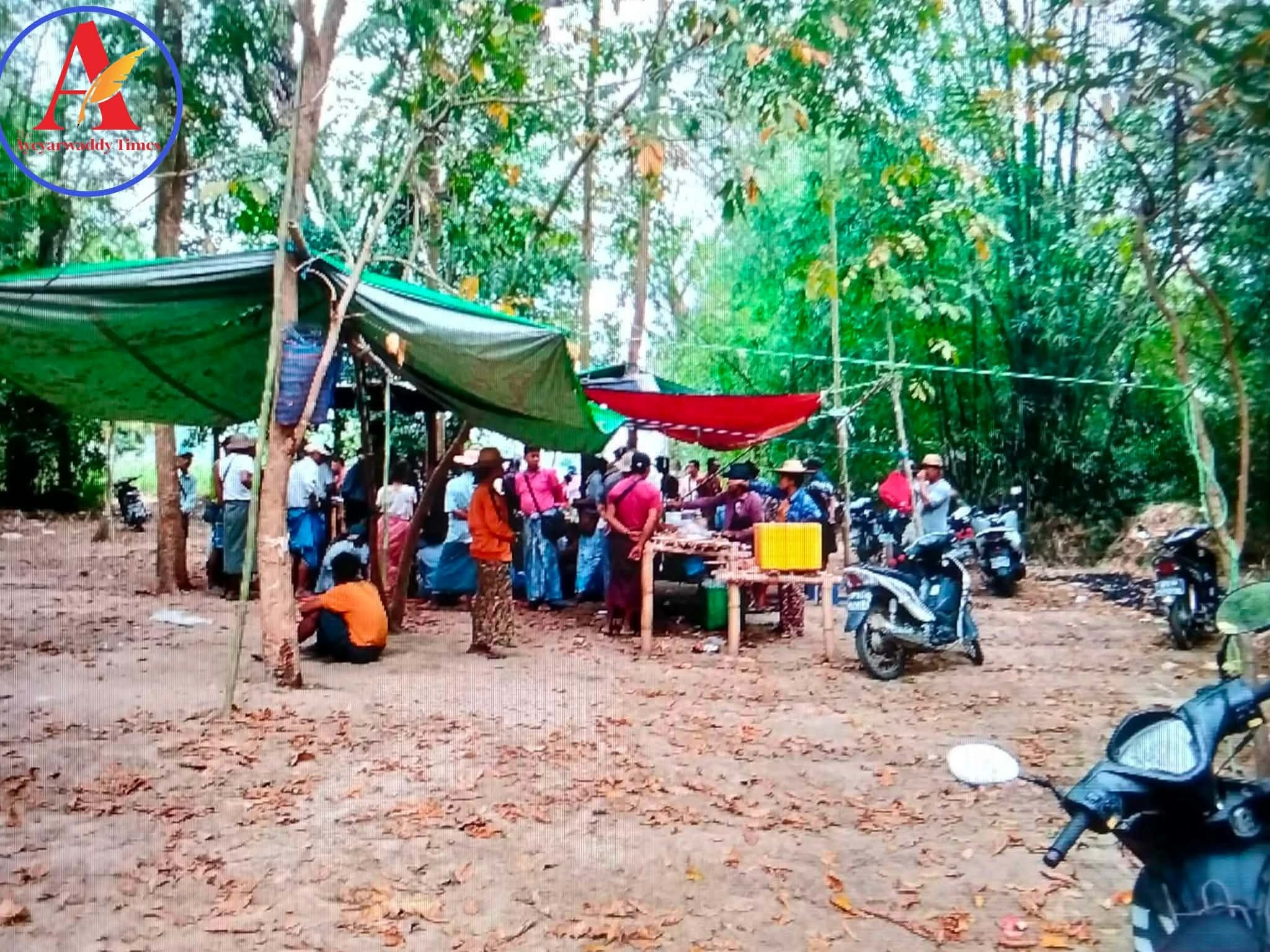 ပုံစာ-ရေကြည်မြို့နယ်၊ ငါးသိုင်းချောင်းမြို့၊ မြစ်ဆယ်အုပ်စု၊ ရွာသစ်ကုန်းကျေးရွာတွင်ပြုလုပ်နေသည့် လောင်းကစားဝိုင်း