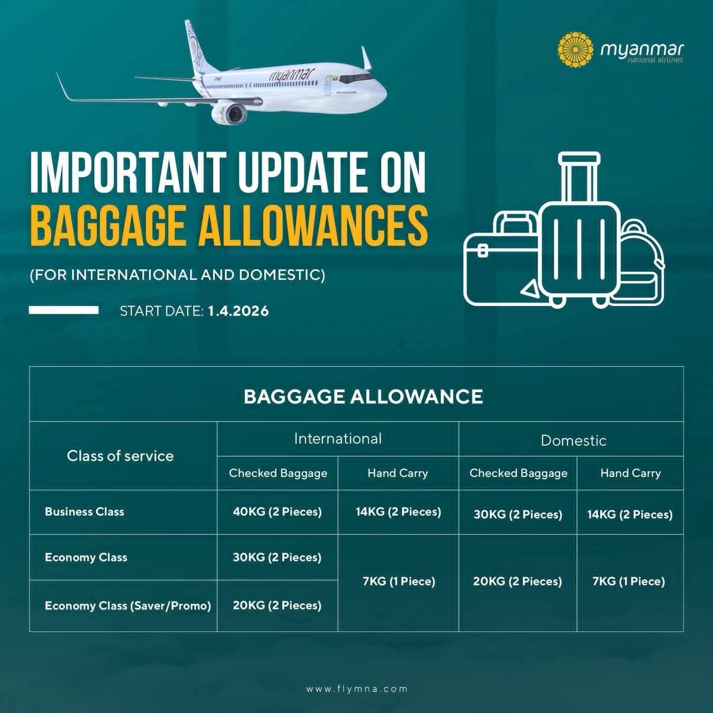 MNA လေကြောင်းလိုင်း၏ ခရီးဆောင်အိတ်သယ်ယူခွင့်သတ်မှတ်ချက်၌ ပြည်တွင်းခရီးစဉ် Business လက်မှတ်အတွက် ၃၀ kg နှစ်အိတ်) ၊ Hand Carry အတွက် ၁၄ kg နှစ်အိတ်၊ Economy လက်မှတ်အတွက် ၂၀ kg နှစ်အိတ်၊ Hand Carry အတွက် ၇ kg တစ်အိတ် အသုံးပြုခွင့်ကို ဧပြီ ၁ ရက်နေ့စတင်မည်ဖြစ်ကြောင်း ထုတ်ပြန်ထားသည်။