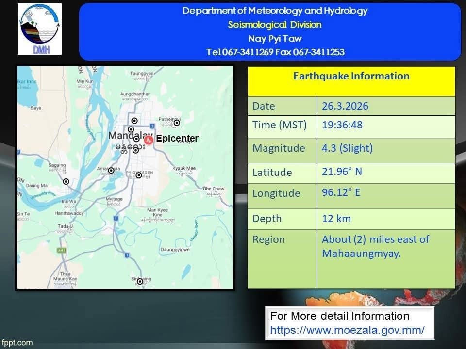 စစ်ကိုင်းငလျှင်ကြီး လှုပ်ခတ်မှုတစ်နှစ်ပြည့်ခါနီးအချိန်တွင် ယင်းနောက်ဆက်တွဲအဖြစ် ယနေ့ မတ် ၂၆ ရက်နေ့၌ မန္တလေးမြို့တွင် အင်အားအသင့်အတင့်ငလျင်လှုပ်ခတ်သွားကြောင်း စစ်ကော်မရှင်လက်အောက်ရှိ မိုးလေဝသနှင့် ဇလဗေဒညွှန်ကြားမှုဦးစီးဌာနက ထုတ်ပြန်သည်။