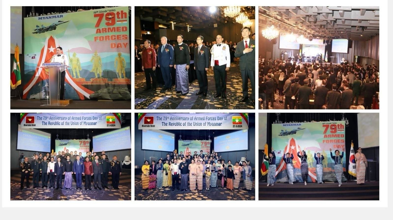 တပ်မတော်နေ့ညစာစားပွဲ ကျင်းပမည့် ဆိုးလ်မြို့ရှိ Mondrian ဟိုတယ်ရှေ့တွင် စစ်အာဏာသိမ်းမှုကို ဆန့်ကျင်သည့် အယောက် ၅ဝ ကျော်က စစ်တပ်၏ လုပ်ရပ်များကို ရှုတ်ချသည့်ပိုစတာများ၊ ဗီနိုင်းများကို ကိုင်ဆောင်ကာ ဆန့်ကျင်ဆန္ဒပြခဲ့ကြကြောင်း သိရသည်။