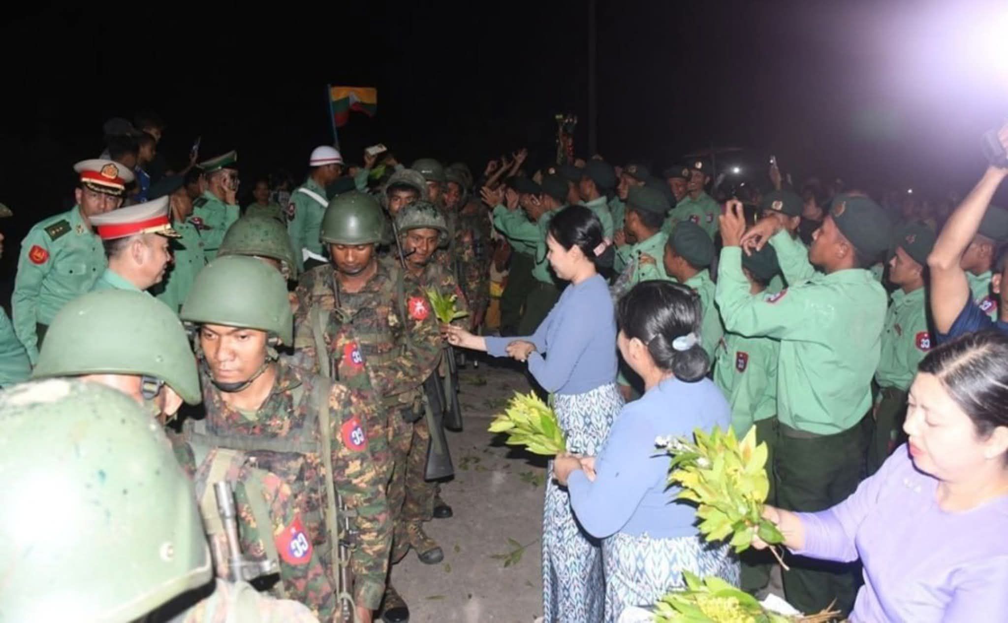 ပုံစာ- စစ်ကော်မရှင်က အောင်ပွဲရသကဲ့သို့ ကြိုဆိုနေသည့် စစ်ကြောင်းပြုတ် တပ်ဖွဲ့ဝင်အချို့ကို တွေ့ရစဉ်။
