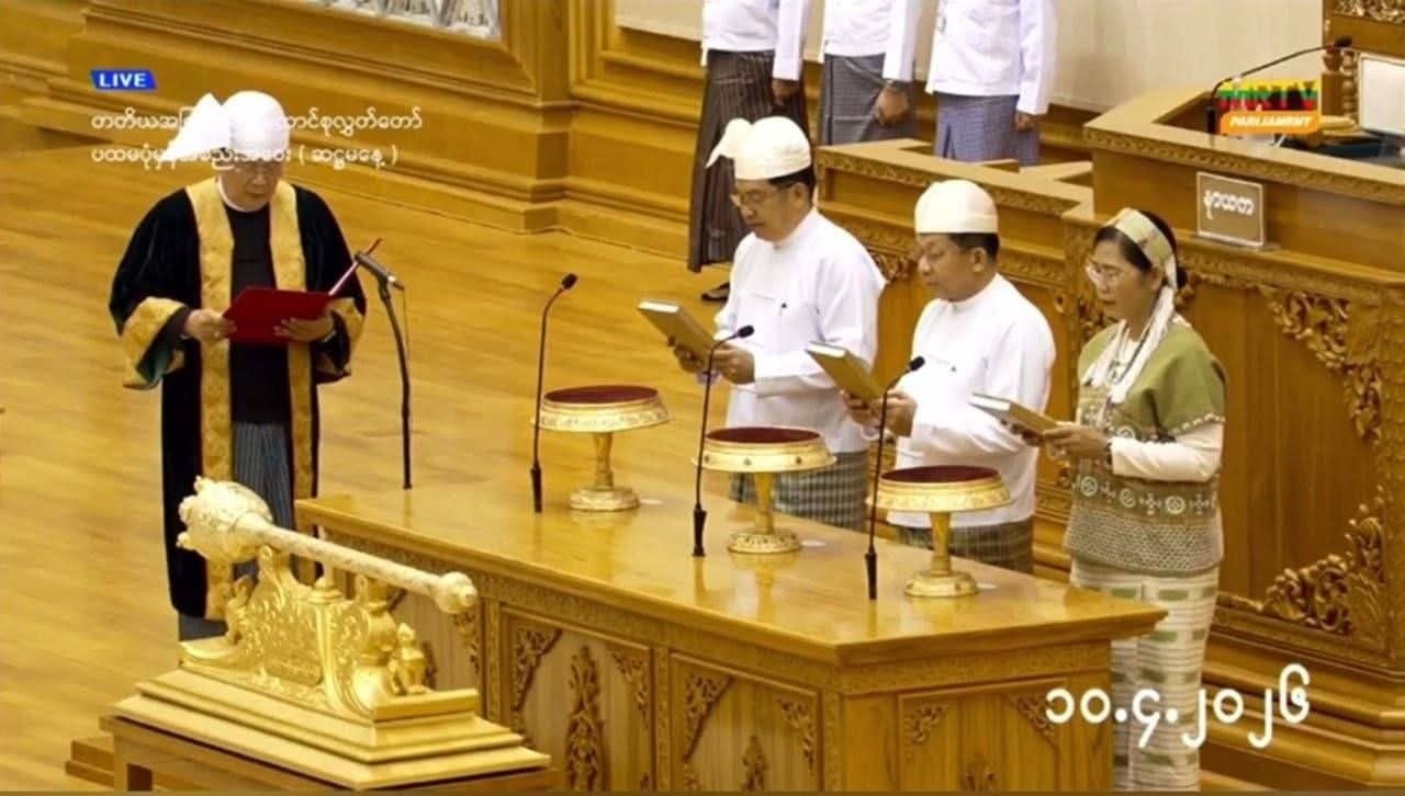 အမည်ခံသမ္မတ ဦးမင်းအောင်လှိုင်နှင့်အတူ ဒုတိယသမ္မတများဖြစ်ကြသည့် ဦးညိုစော၊ ဒေါ်နန်းနီနီအေး တို့သည် ပြည်ထောင်စုလွှတ်တော် နာယက ရှေ့မှောက်၌ ကတိသစ္စာပြုခဲ့ကြပြီး ကတိသစ္စာပြုလွှာပေါ်တွင် လက်မှတ်ရေးထိုးခဲ့ကြသည်။