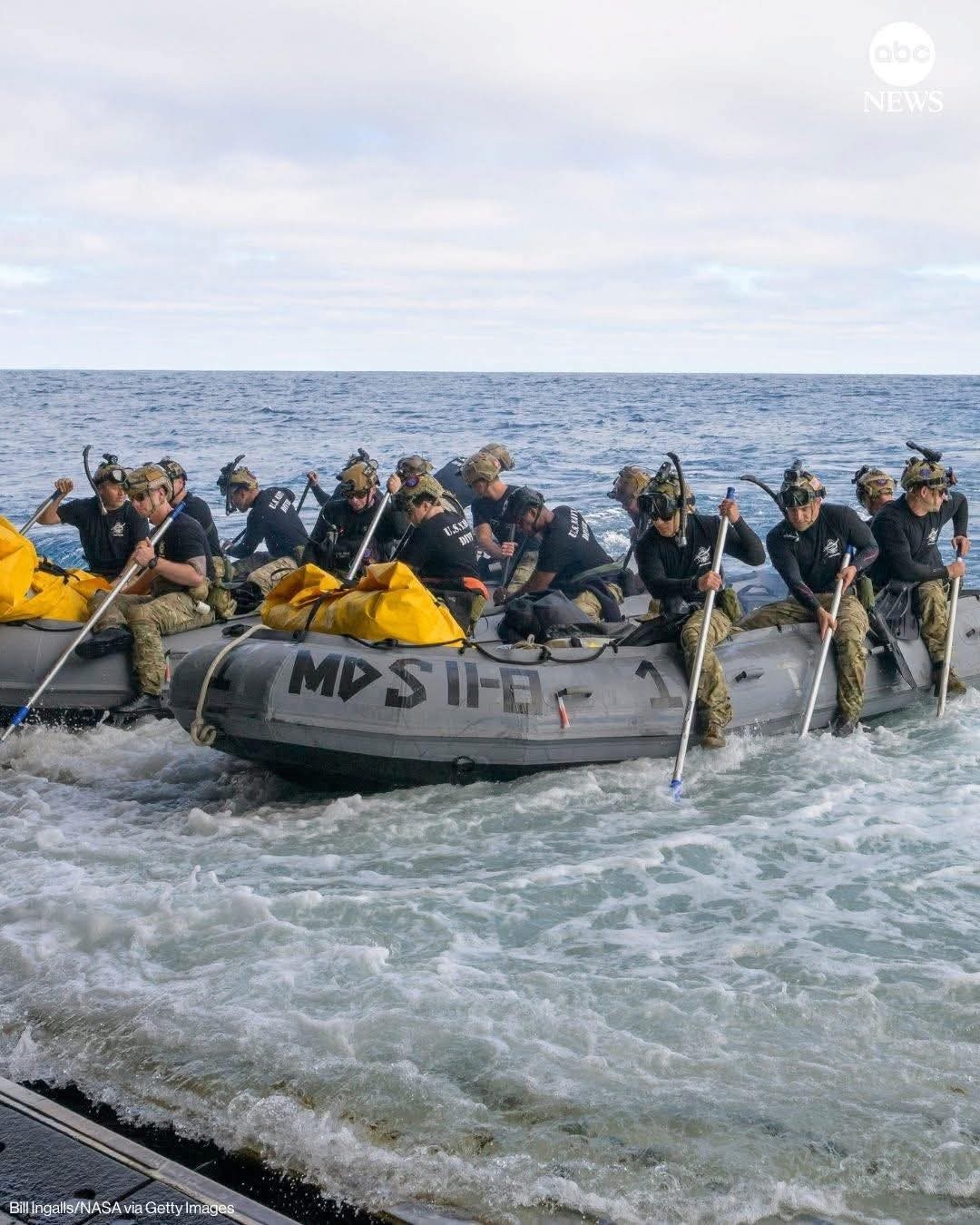 အဖွဲ့ခေါင်းဆောင် ရီဒ်ဝိုက်စ်မန်းက အာကာသယာဉ်မှူးအားလုံး ကျန်းမာရေးကောင်းမွန်ကြောင်း မြေပြင်ထိန်းချုပ်ရေးစခန်းသို့ အစီရင်ခံခဲ့ပြီးနောက် ၎င်းတို့ကို ရဟတ်ယာဉ်များဖြင့် U.S.S. John P. Murtha သင်္ဘောပေါ်သို့ ပို့ဆောင်ခဲ့သည်။