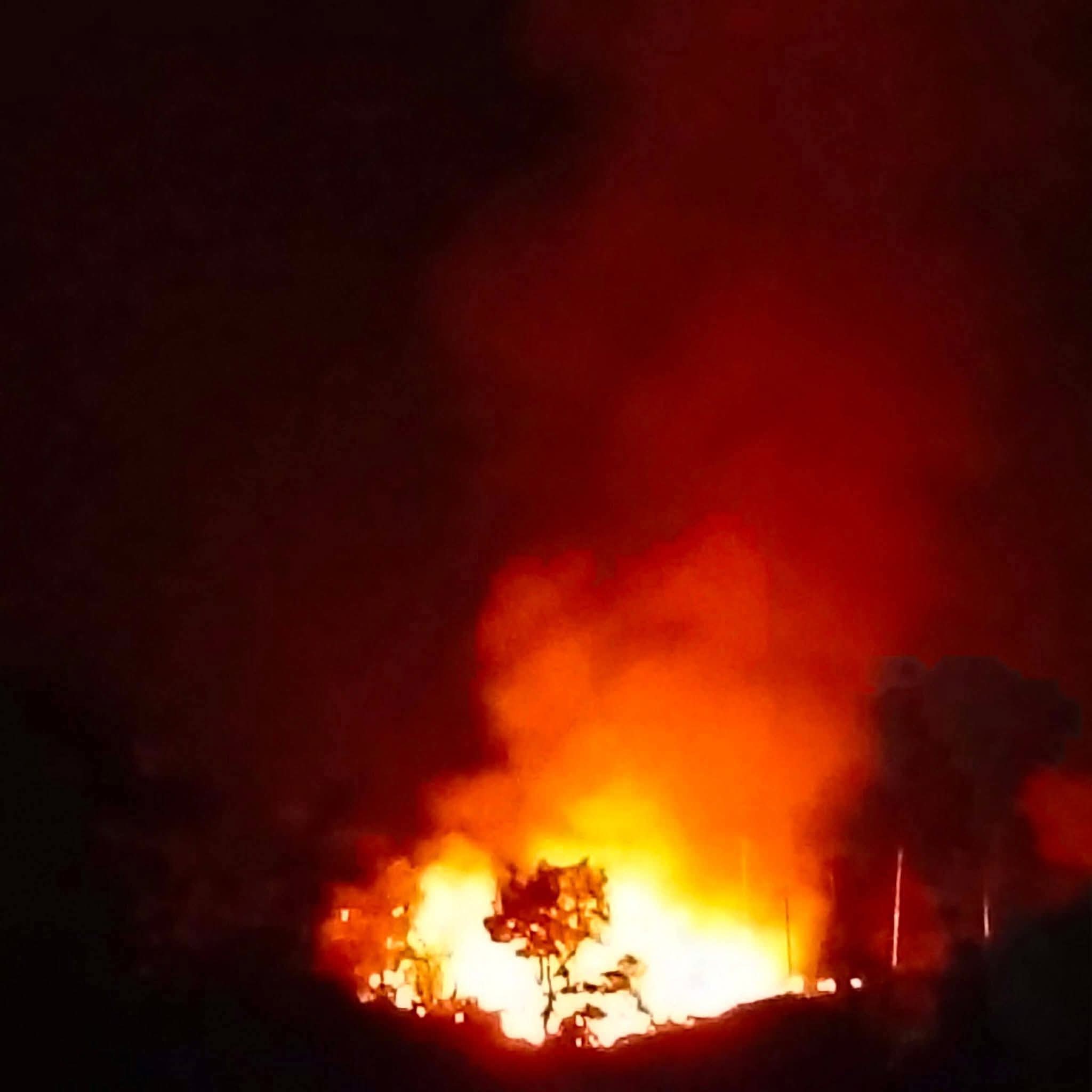 ဓာတ်ပုံ – မင်းတပ်မြို့ လေကြောင်းတိုက်ခိုက်ခံရမှုကြောင့် လူနေအိမ်များ မီးလောင်နေစဉ်။