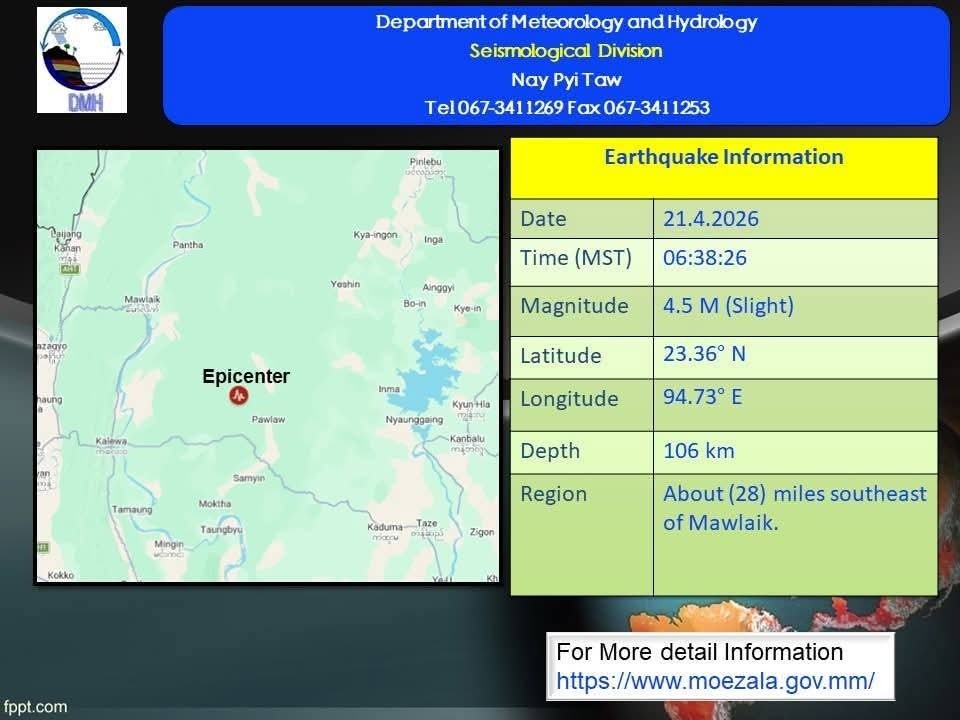 မြန်မာနိုင်ငံ နှင့် မြန်မာ – အိန္ဒိယနယ်စပ်တွင် ယနေ့ ဧပြီ ၂၁ ရက်နေ့က အင်အားအသင့်အတင့်ရှိသော ငလျင်လှုပ်ခတ်သွားကြောင်း မိုးလေဝသနှင့်ဇလဗေဒညွန်ကြားမှုဦးစီးဌာန(မိုး/ဇလ)က ထုတ်ပြန်သည်။