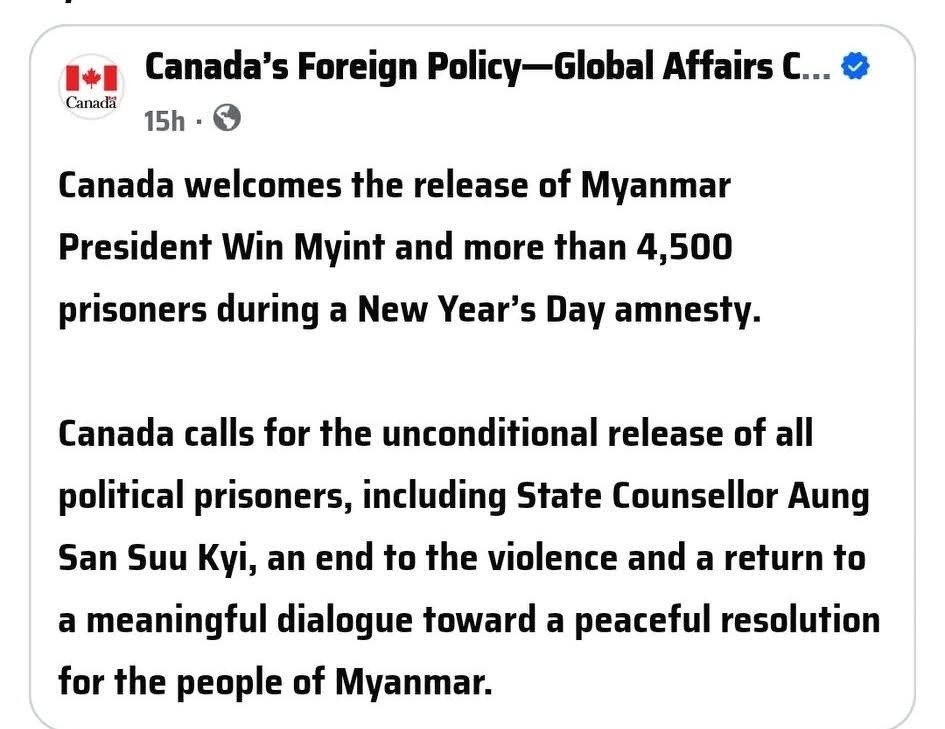 ကနေဒါနိုင်ငံ နိုင်ငံခြားရေးဝန်ကြီးဌာန၏ ထုတ်ပြန်ချက်တွင် မြန်မာနှစ်သစ်ကူး လွတ်ငြိမ်းချမ်းသာ ခွင့်ဖြင့် ပြည်သူလူထုရွေးကောက်ခံ သမ္မတဦးဝင်းမြင့် ပြန်လည်လွတ်မြောက်လာမှုကို ကြိုဆိုကြောင်း ဖော်ပြထားပြီး ၎င်းနှင့်အတူ ဒေါ်အောင်ဆန်းစုကြည်ကိုပါ မြန်မာနိုင်ငံ၏ တရားဝင်နိုင်ငံတော် အကြီးအကဲများအဖြစ် ဆက်လက် အတည်ပြုထားခြင်း ဖြစ်သည်။